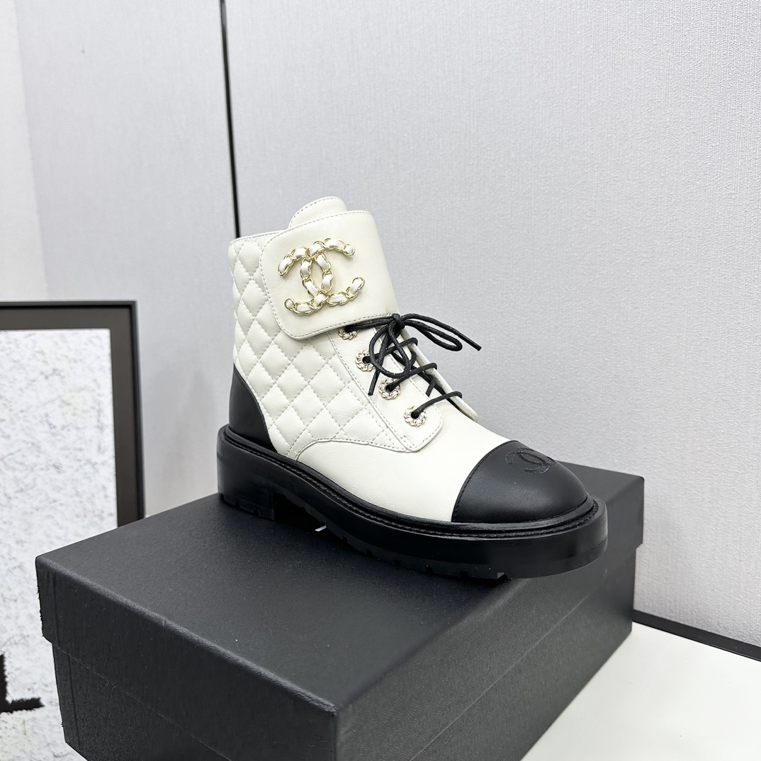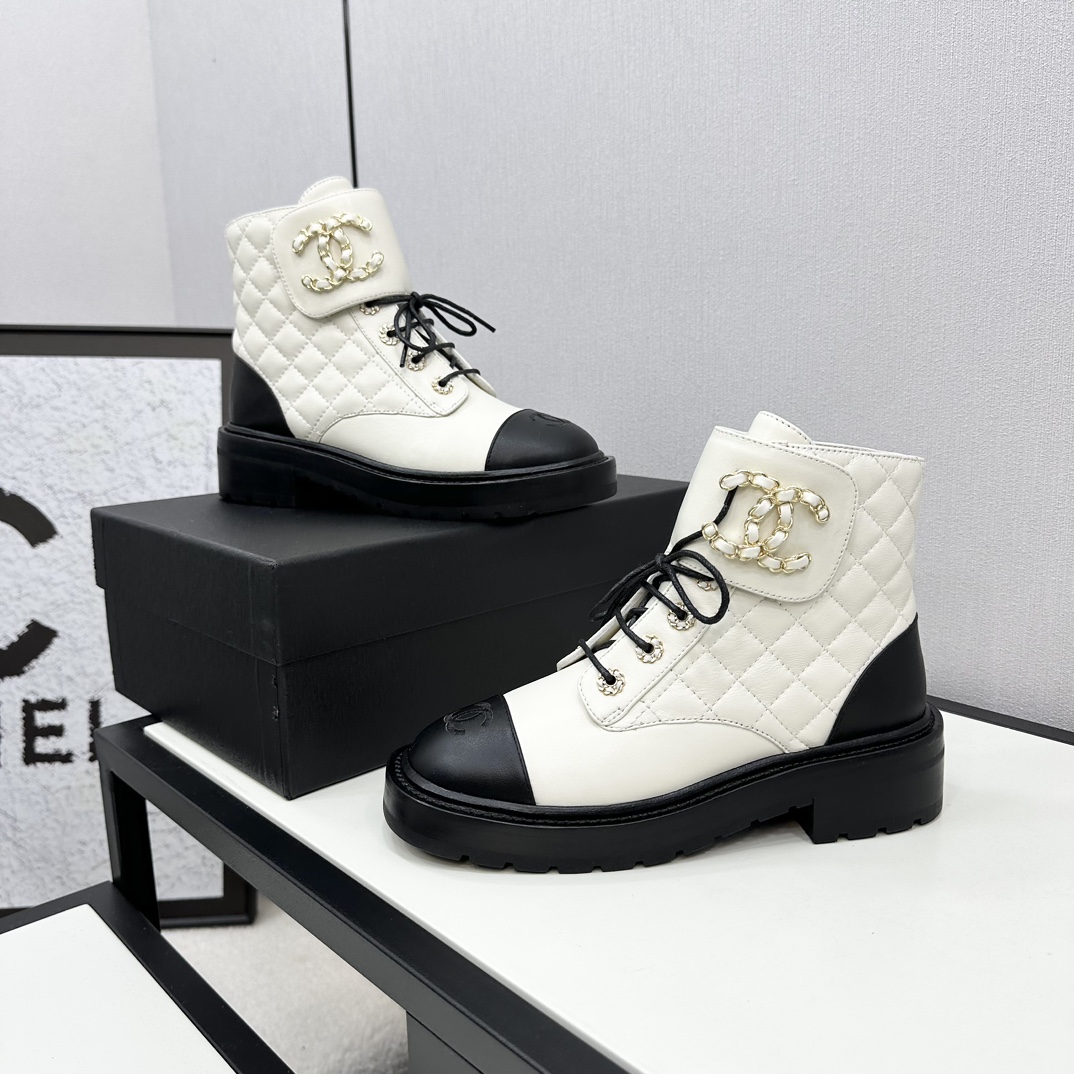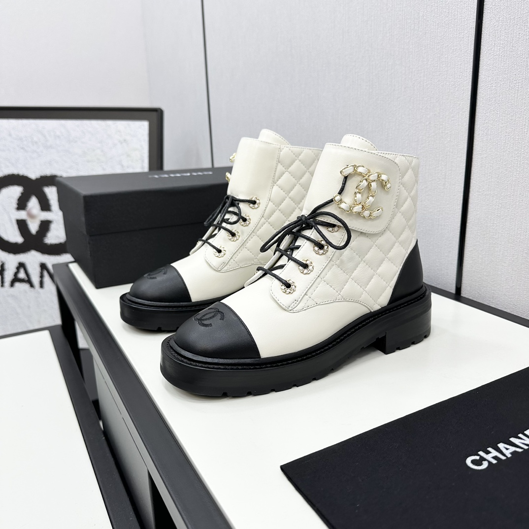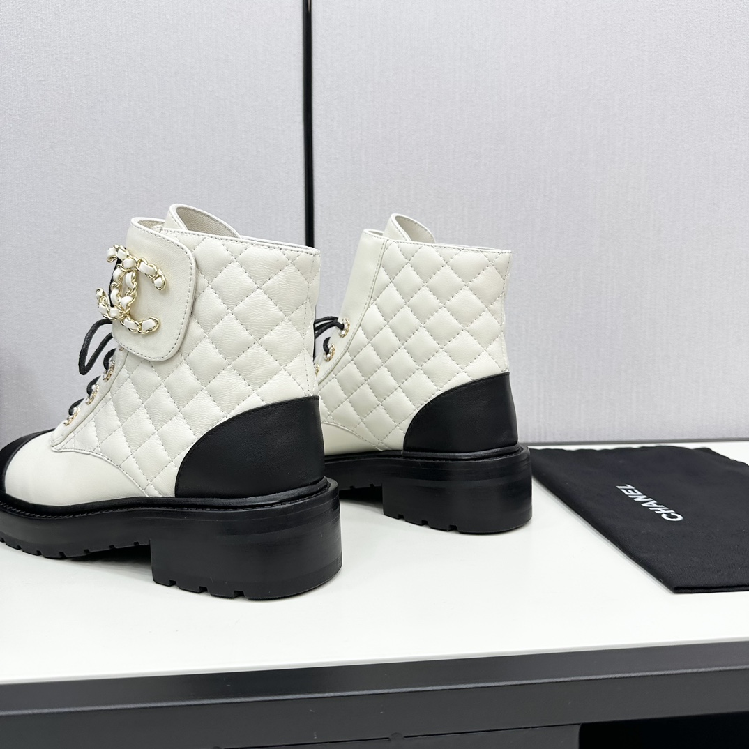 Ch**el CREAM AND BLACK LEATHER CAP-TOE LOGO COMBAT BOOTS WS8385 Master Quality