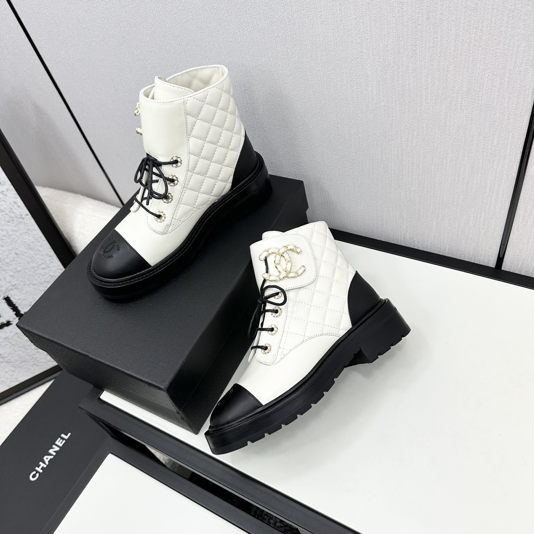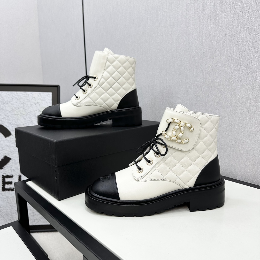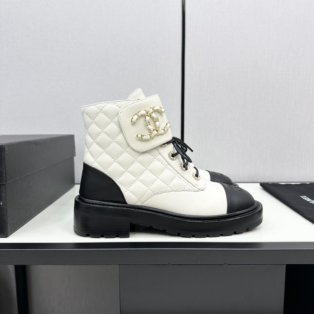 Ch**el CREAM AND BLACK LEATHER CAP-TOE LOGO COMBAT BOOTS WS8385 Master Quality