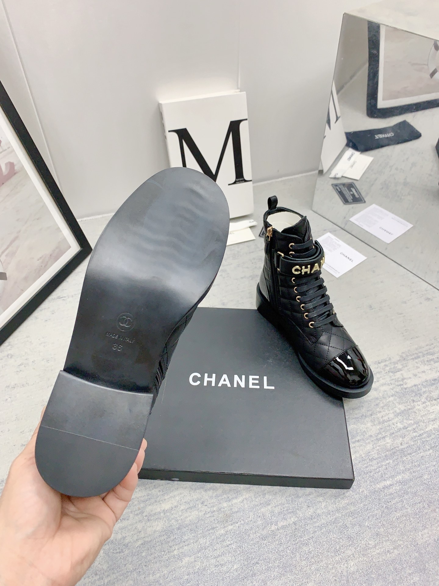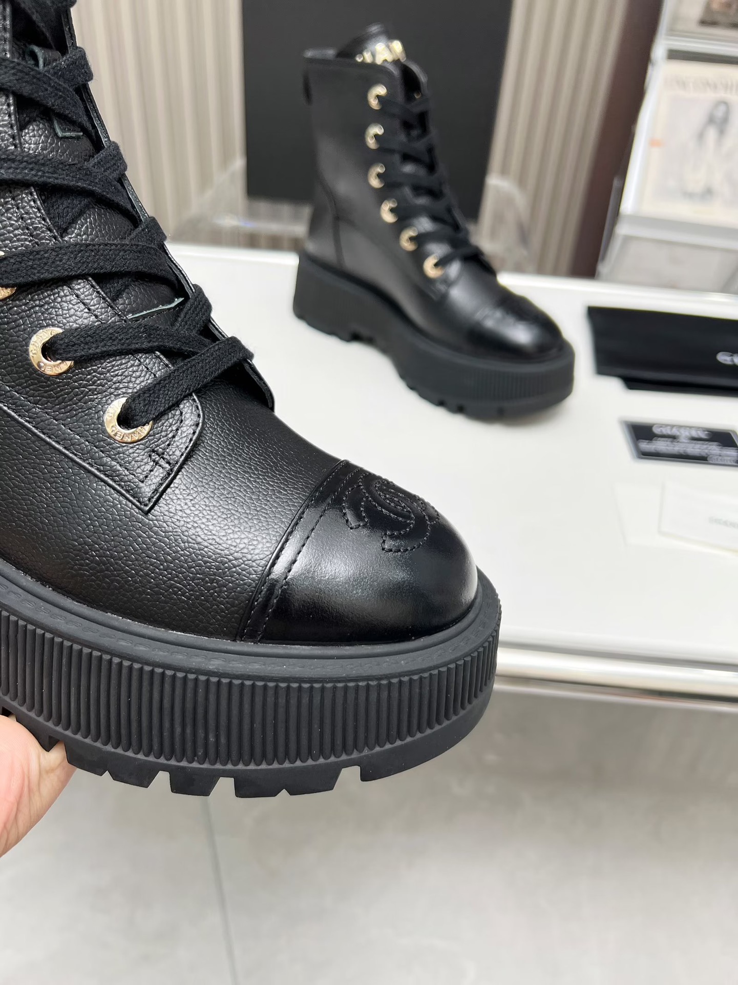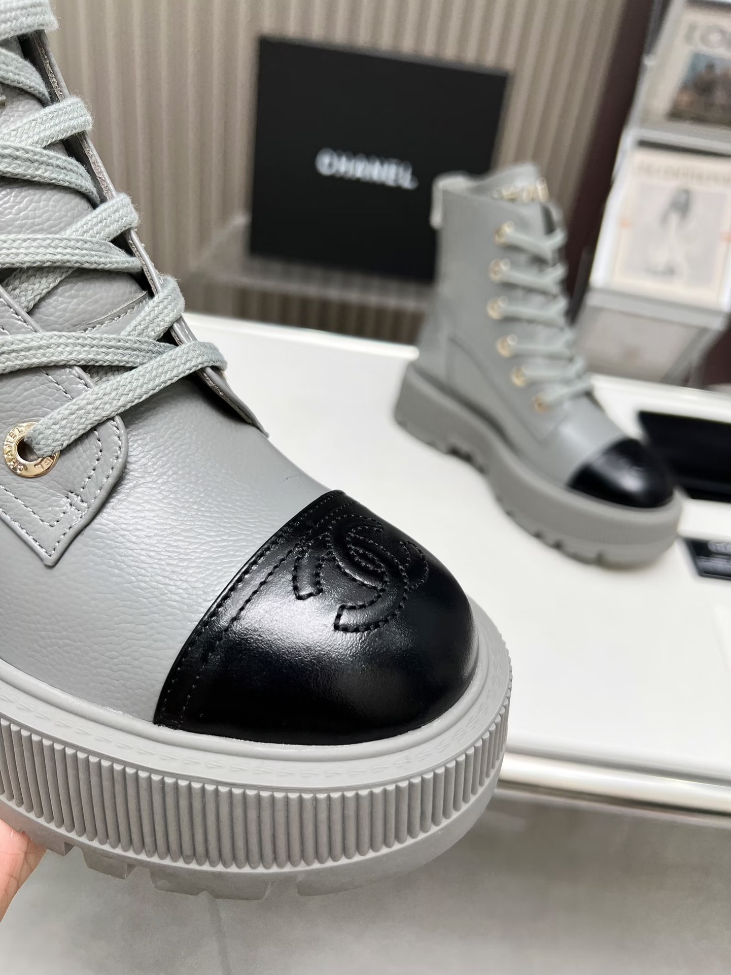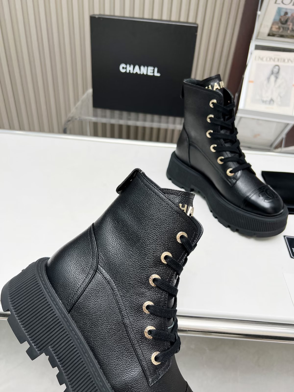 Ch**el CREAM AND BLACK LEATHER CAP-TOE LOGO COMBAT BOOTS WS8385 Master Quality