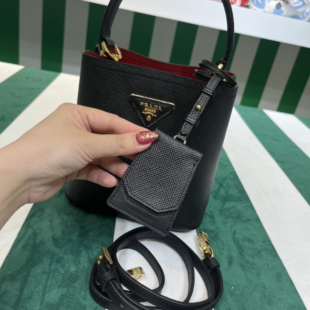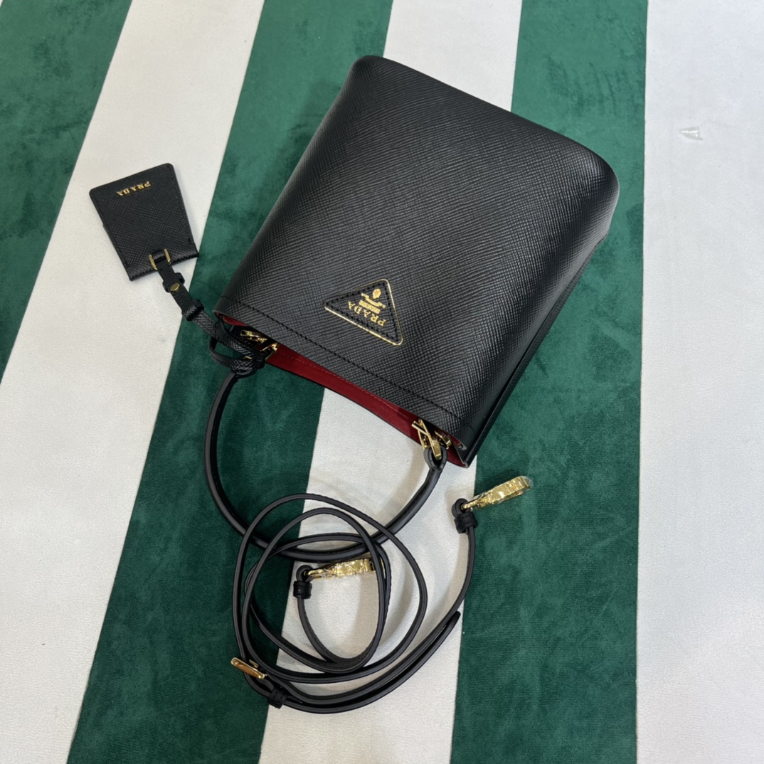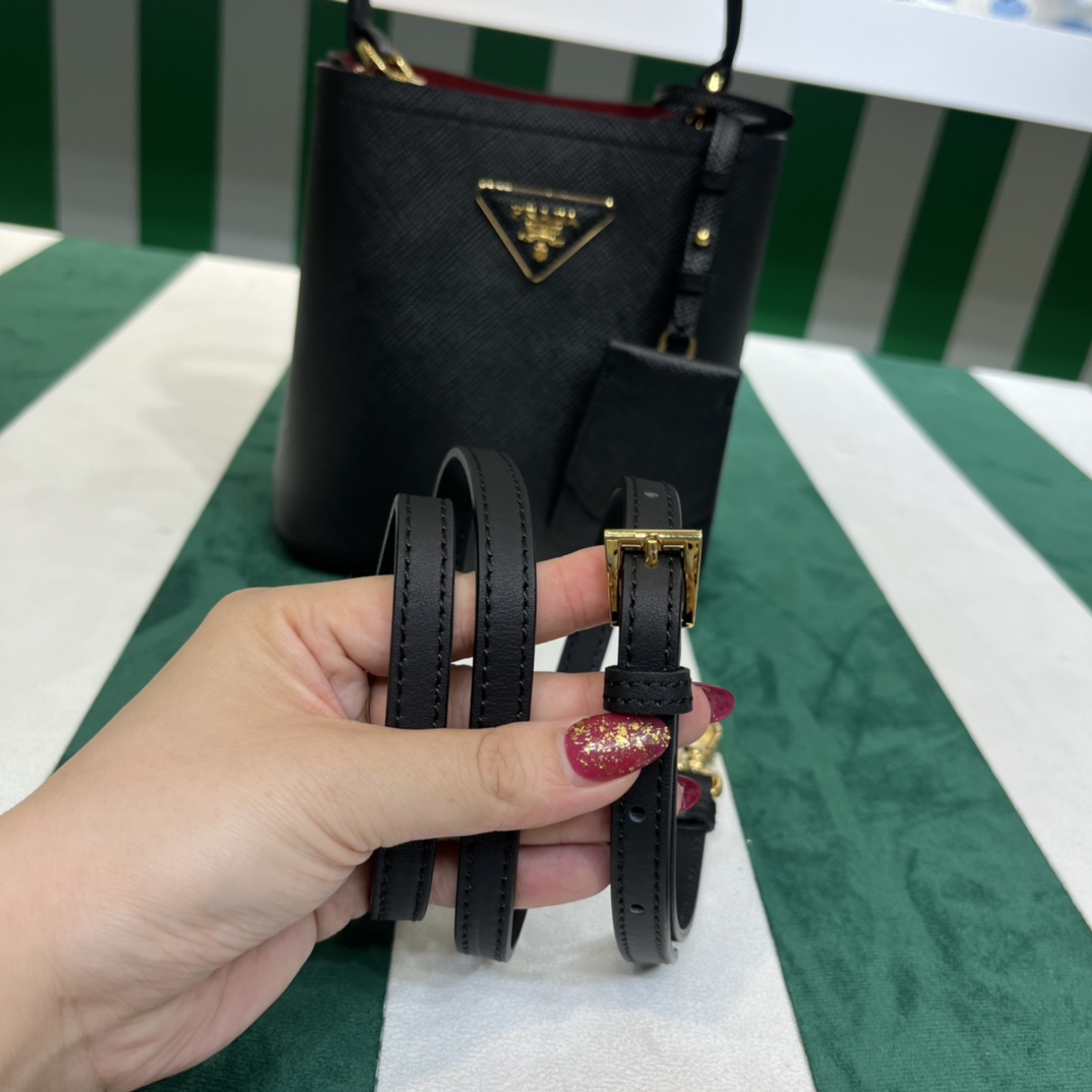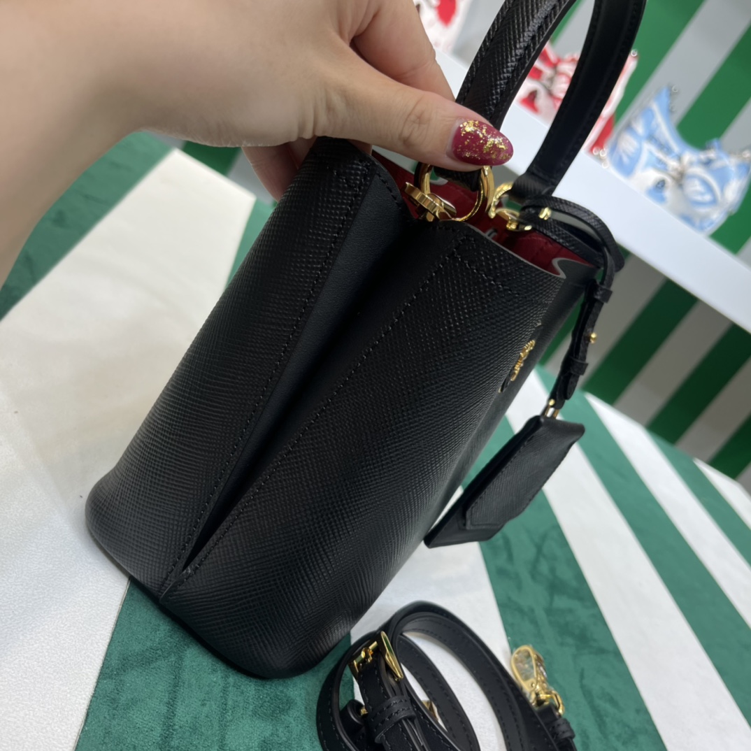 Pra*a Mini 1BA349 Tote Bag – Black Deer-Grain Calfskin with Gold Hardware, 18 x 16 x 10 cm Master Quality